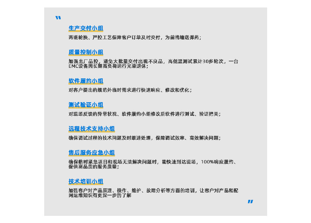 以“通過5+2區(qū)域所有地市的入網(wǎng)檢測、一級重點保障區(qū)域服務響應率100%(廣州服務響應0投訴)”為工作目標,總經(jīng)理親自掛帥,制造部、電網(wǎng)產(chǎn)品部、電網(wǎng)技術管理部、電網(wǎng)技術服務部、電網(wǎng)市場部、體系辦、中試部、測試部共同參與的行動一觸即發(fā),多個專項工作組立刻高速運轉: