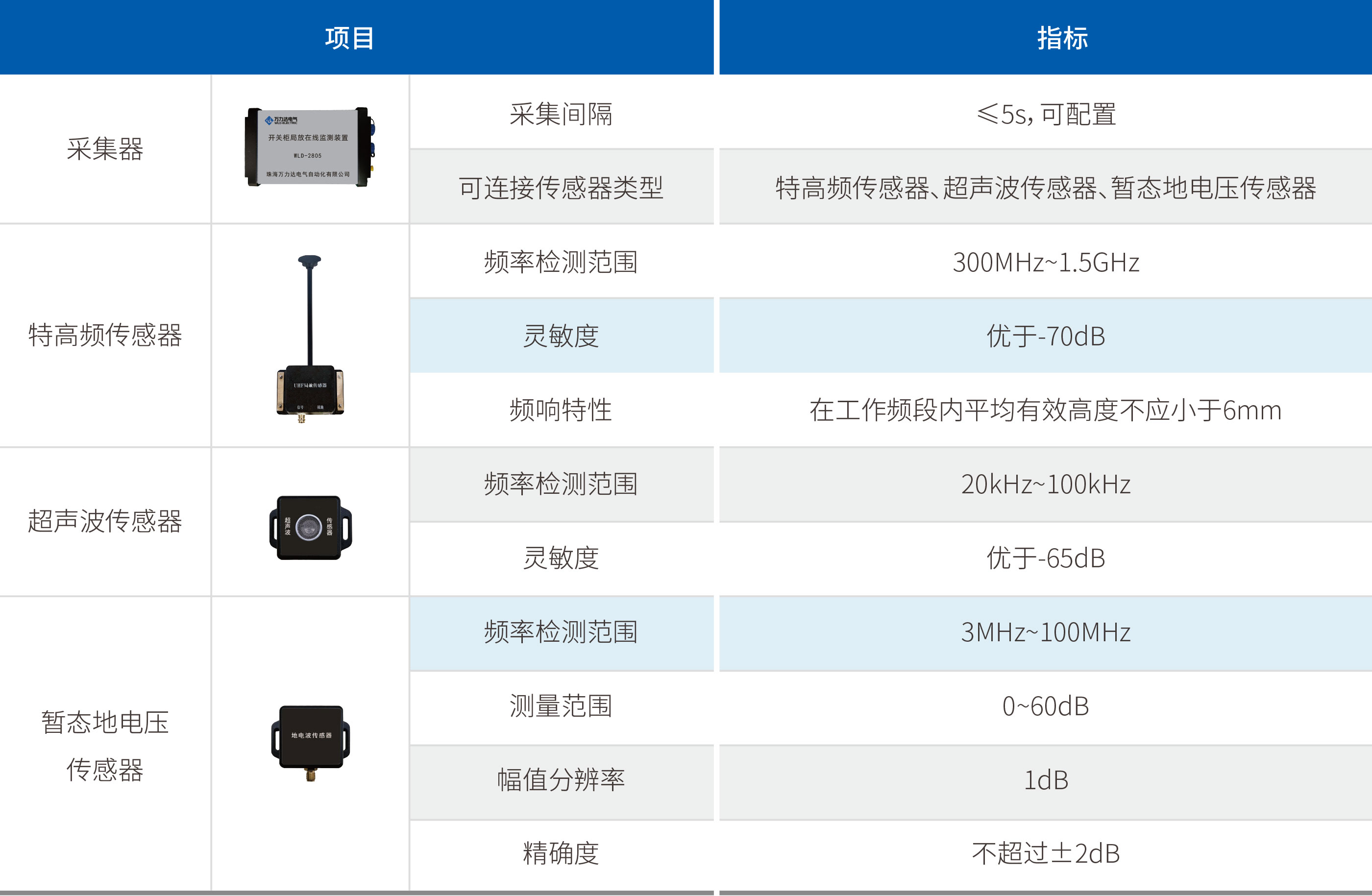 開關柜局放在線監測裝置實時監測高壓開關柜內產生的特高頻、地電波、超聲波類型的局部放電信號。采集相關信號的放電峰值、頻次、均值、噪聲水平、脈沖周期等數據,并將采集的信號上送至采集器,采集器將相關數據上傳至分析平臺,由分析平臺對高壓開關柜內局部放電情況進行分析、判斷、預警、評估。