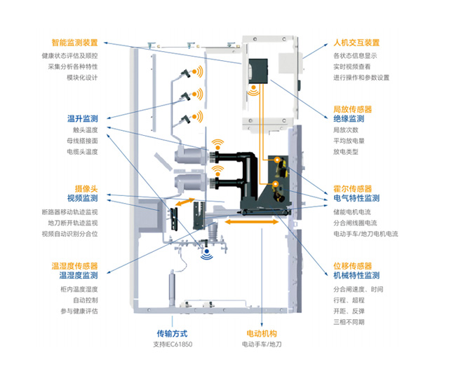 通過在普通開關(guān)柜中植入各種非介入式傳感器,如紅外位移傳感器/角位移傳感器、無線測(cè)溫傳感器、高精度霍爾傳感器以及加裝電動(dòng)小車、電動(dòng)地刀等電動(dòng)機(jī)構(gòu),可實(shí)現(xiàn)智能停送電及健康管理功能,極大提高操作安全性和效率。